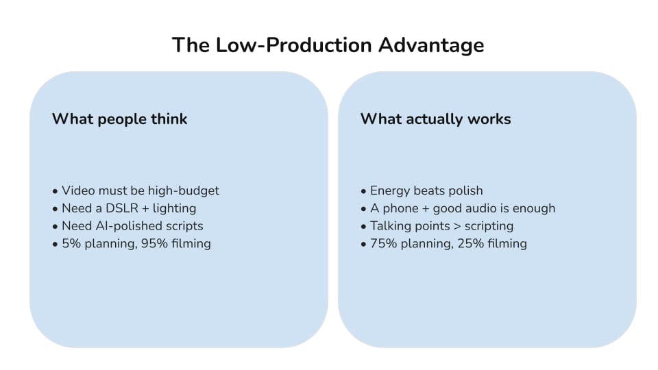 Especially as AI-generated content becomes more common, being visibly human is a real advantage. Video allows you to show passion, opinions, and energy, and that’s what people connect with.